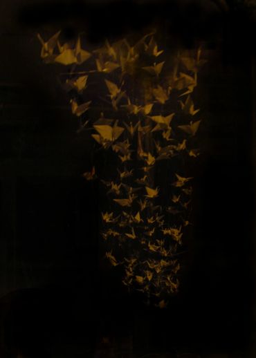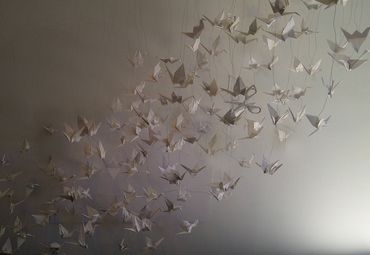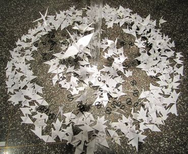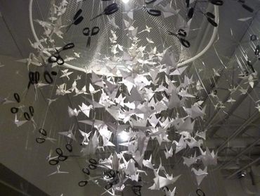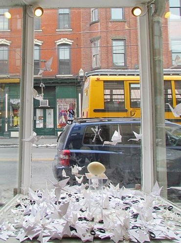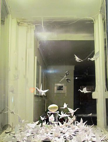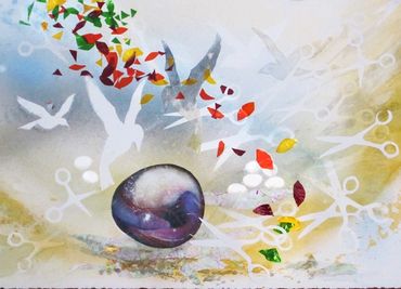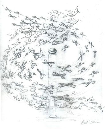 Rock-Paper-Scissors 1, The Wish Installation, for Hudson Valley Artists 2012: Dear Mother Nature at the Samuel Dorsky Museum of the State University of New York (SUNY), New Paltz, 2012. Paper, scissors, plexiglass, emu egg. Included are some preliminary concept studies on paper.