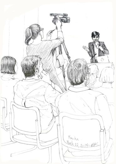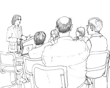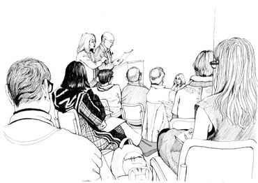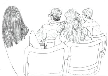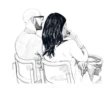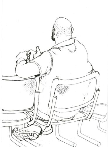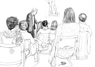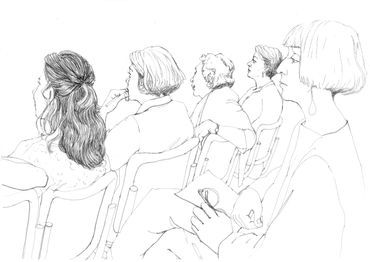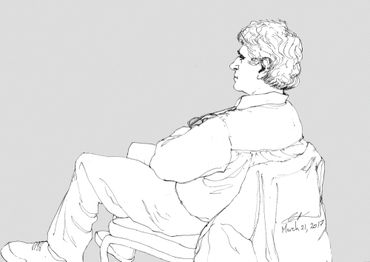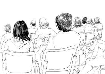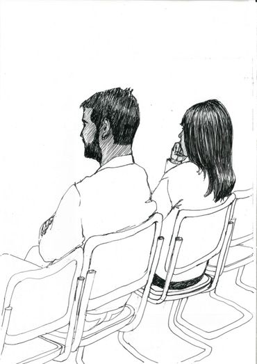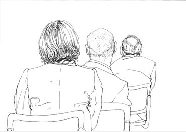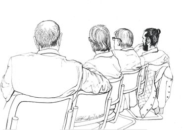 This is a series of drawings in ink on paper done over a 9 month period in Berlin where every Tuesday morning I attended colloquia (lectures & discussions) on various topics, mostly scientific. During the course of the colloquia, I documented the other attendees or "listeners" through drawing. I was fascinated at how the backs of people, their attitudes while listening, could be as informative as their front views.